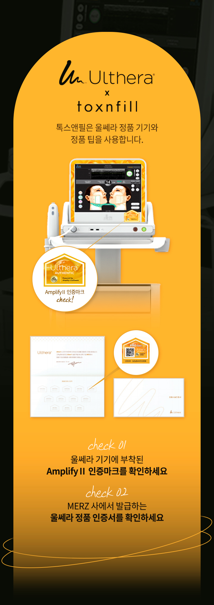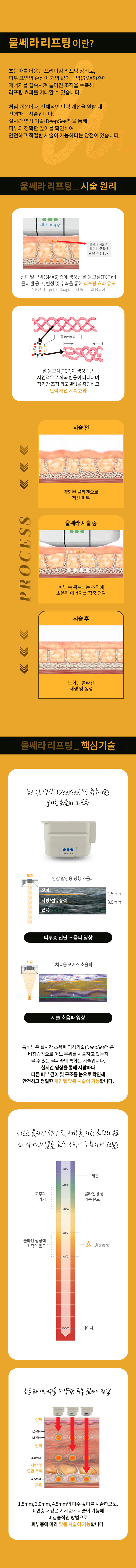 울쎄라는 FDA와 KFDA의 정식 승인으로 안전성과 효능을 입증받은 신개념 리프팅 장비입니다. 초음파 에너지를 이용하여 피부의 자연스러운 회복 능력을 유도해 탄력, 주름을 개선하기 때문에 부작용이 거의 없으며 피부 절개나 다른 물질을 삽입하는 방식이 아니기 때문에 흉터가 남지 않고 회복 기간이 거의 필요하지 않습니다. 초음파 영상 장치를 이용해 피부 속을 직접 확인하면서 시술이 가능하며 울쎄라의 타깃이 되는 SMAS층의 위치도 모니터를 통해 확인하며 치료하기 때문에 보다 정확하고 섬세한 시술이 가능합니다.