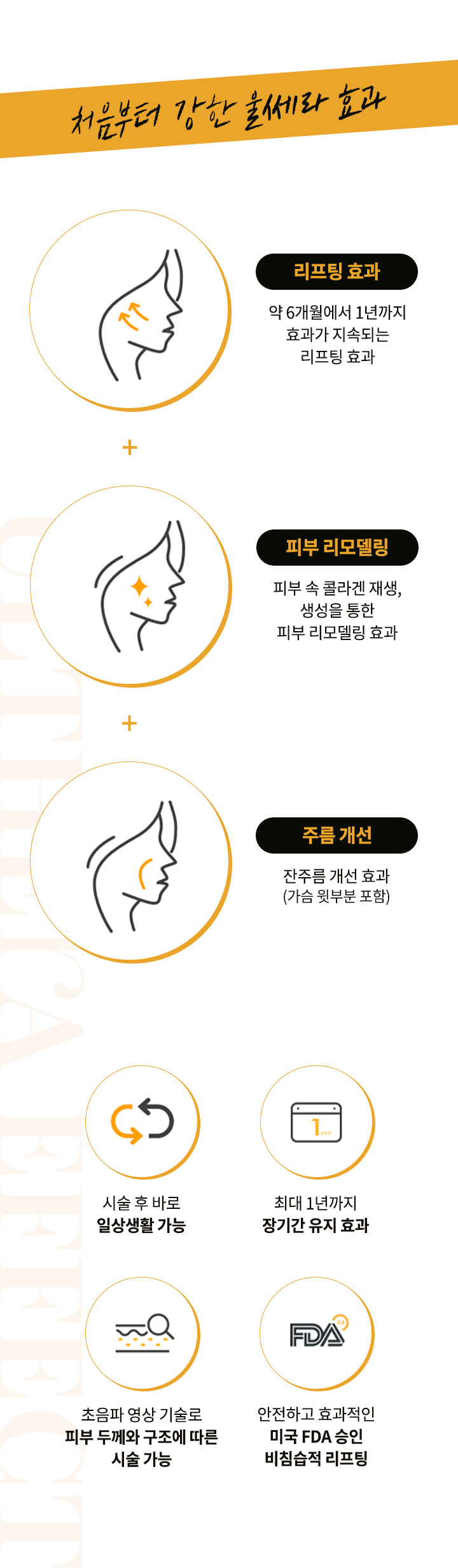 피부 표면의 손상 없이 근막(SMAS) 층에 에너지를 집속 시켜 늘어진 조직을 수축해 리프팅 효과를 기대할 수 있습니다.